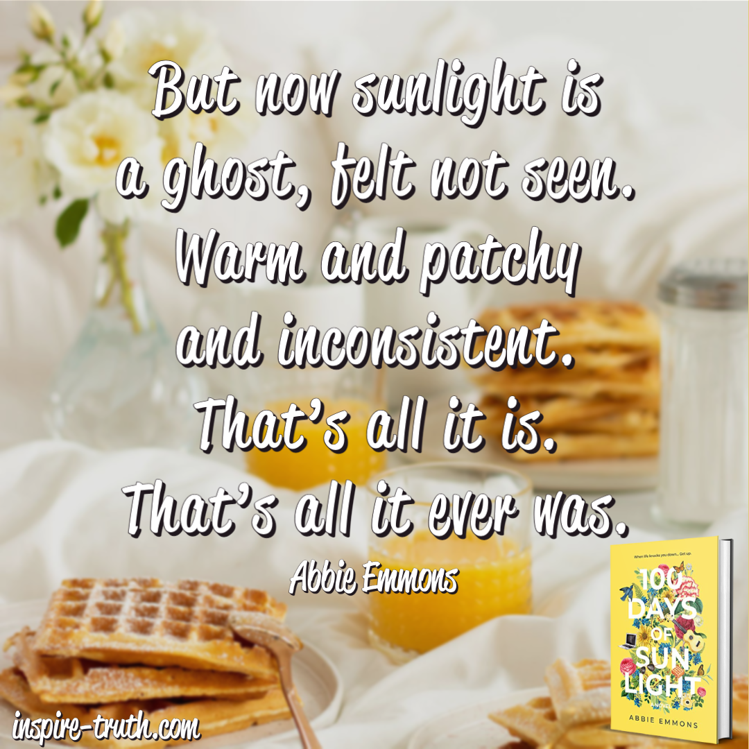 Abbie Emmons is a breath of fresh air! An incredibly talented author, her debut novel, 100 Days of Sunlight, is a unique page-turner that takes readers on a journey to learn what it means to be live without limitations. Full of hope, love, and perseverance, the story shines as bright as its cover. Encompassing what it means to be alive and whole, this novel will knock the socks off your feet (some pun intended) and sweep you into a world where giving up is not an option.