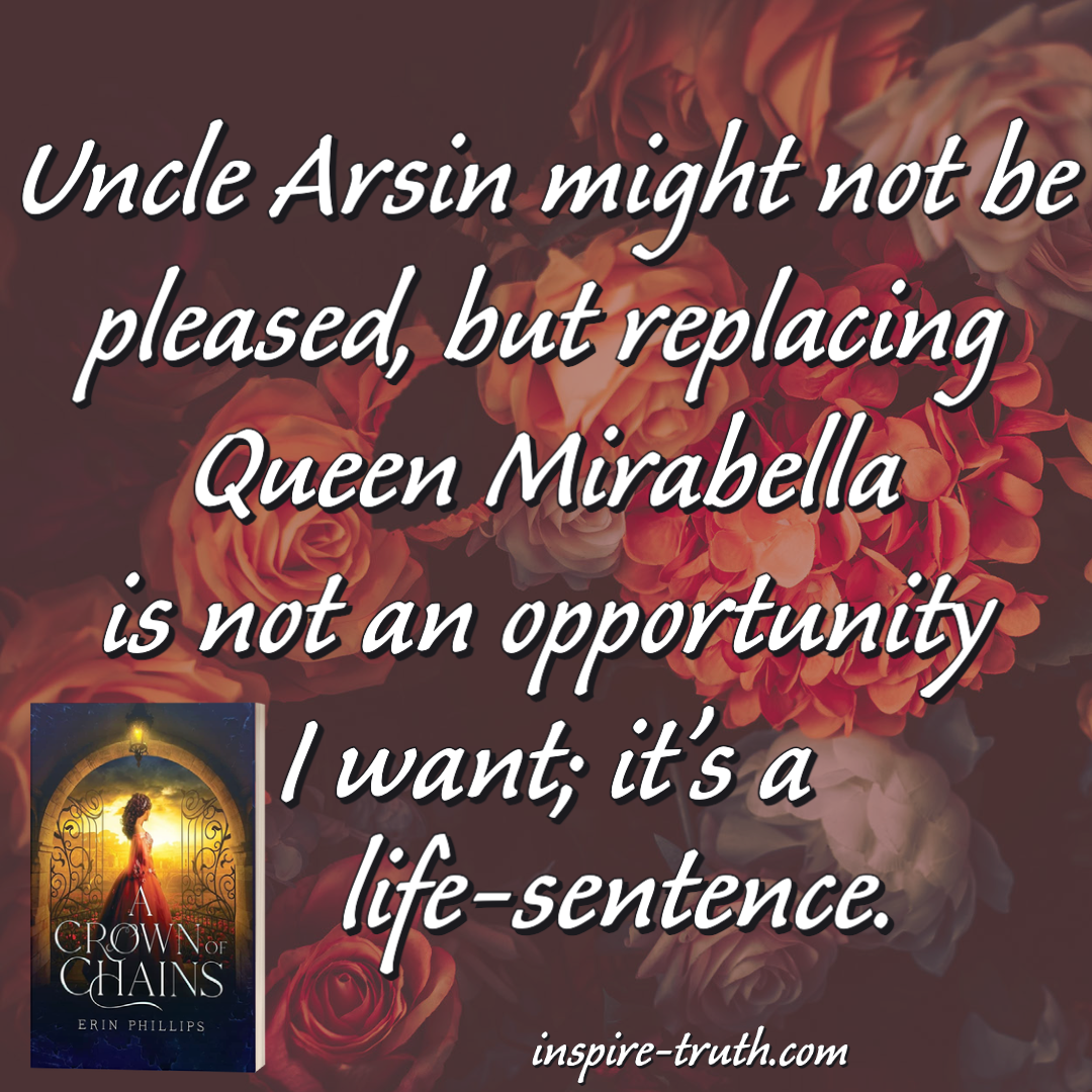 “Uncle Arsin might not be pleased, but replacing Queen Mirabella is not an opportunity I want; it’s a life-sentence.” ~ Erin Phillips