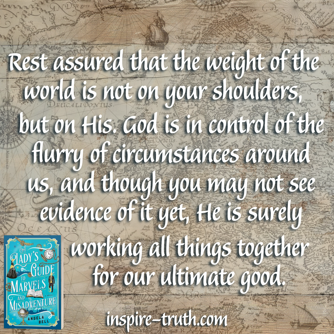 - “Rest assured that the weight of the world is not on your shoulders, but on His. God is in control of the flurry of circumstances around us, and though you may not see evidence of it yet, He is surely working all things together for our ultimate good.” ~ Angela Bell