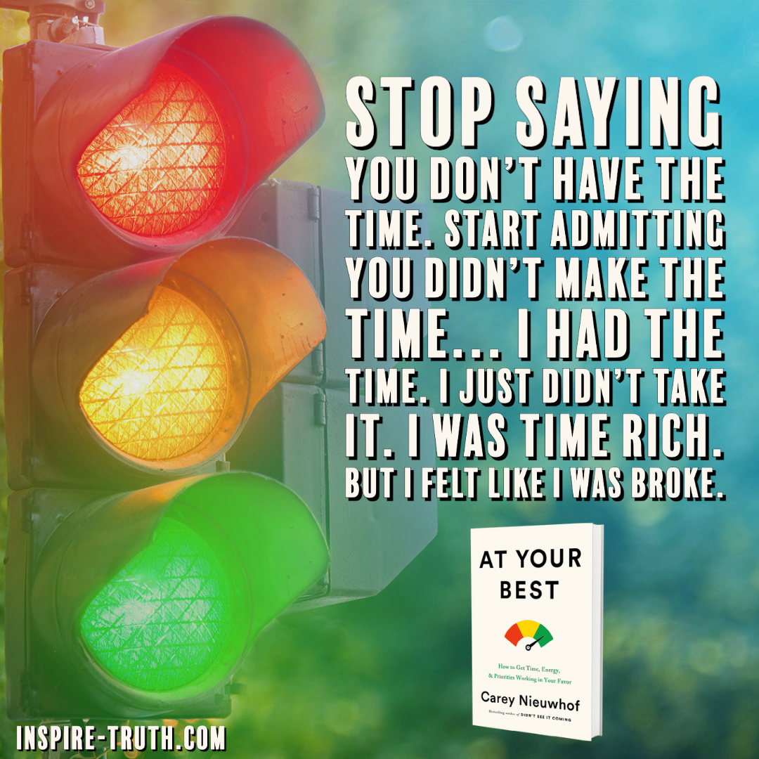 - “The first step to focusing your time is to start telling the truth about time. Stop saying you don’t have the time. Start admitting you didn’t make the time… I had the time. I just didn’t take it. I was time rich. But I felt like I was broke.” ~ Carey Nieuwhof