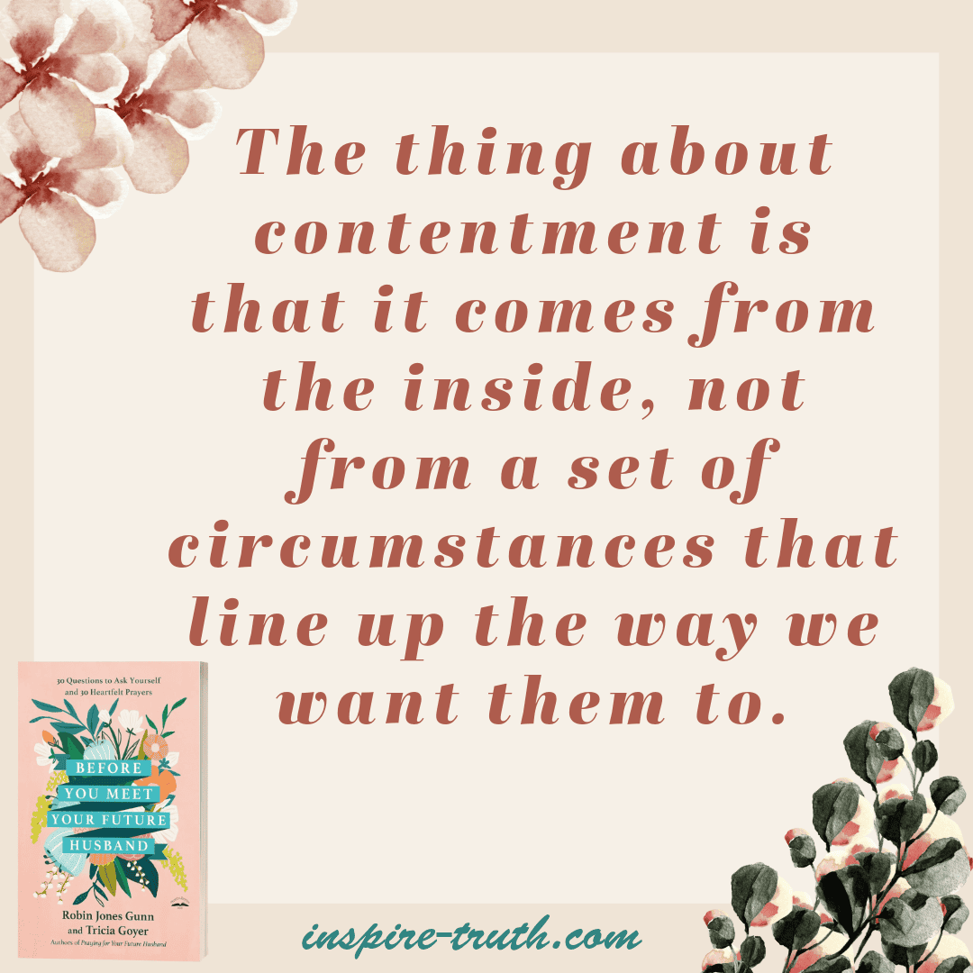 - “The thing about contentment is that it comes from the inside, not from a set of circumstances that line up the way we want them to.” ~ Robin Jones Gunn and Tricia Goyer