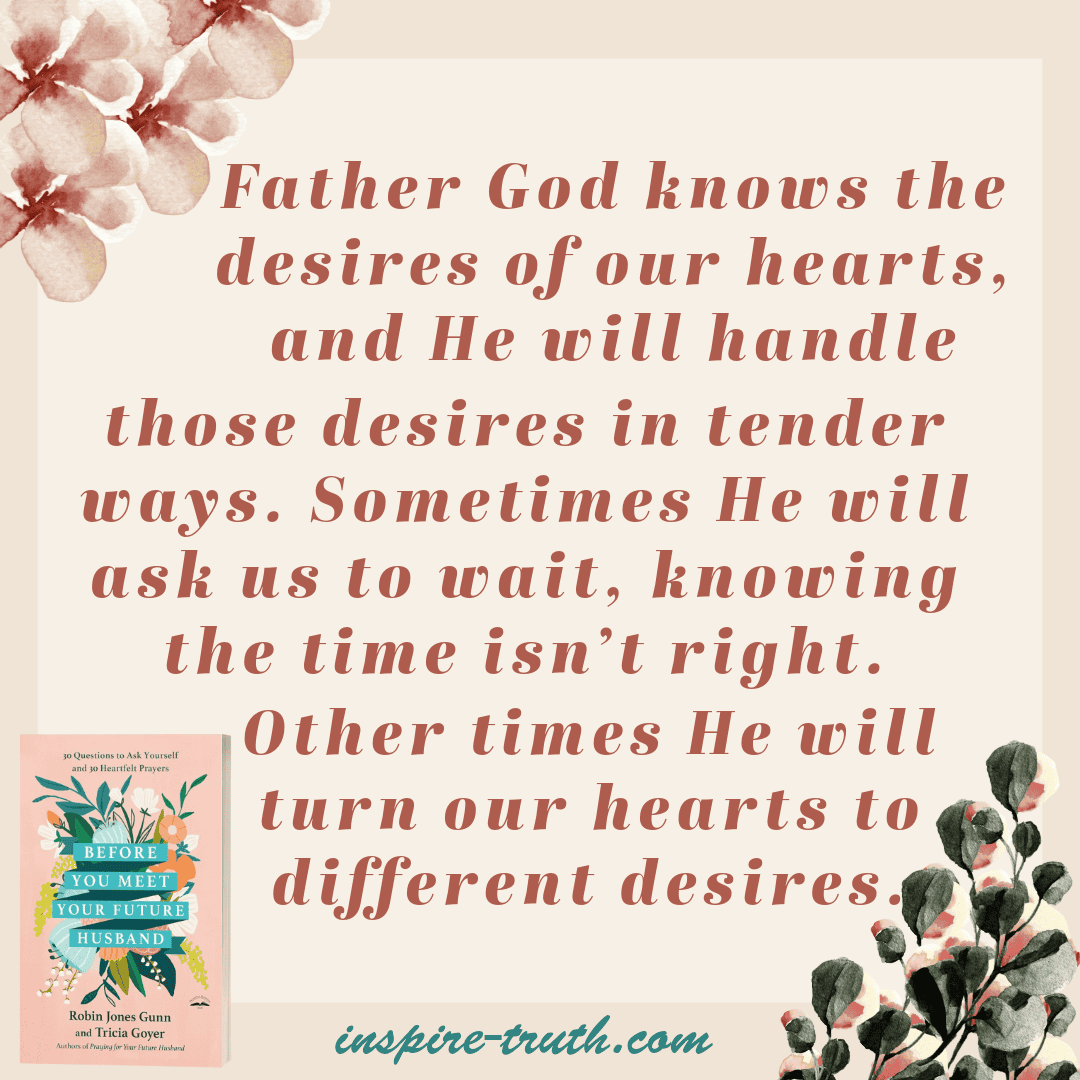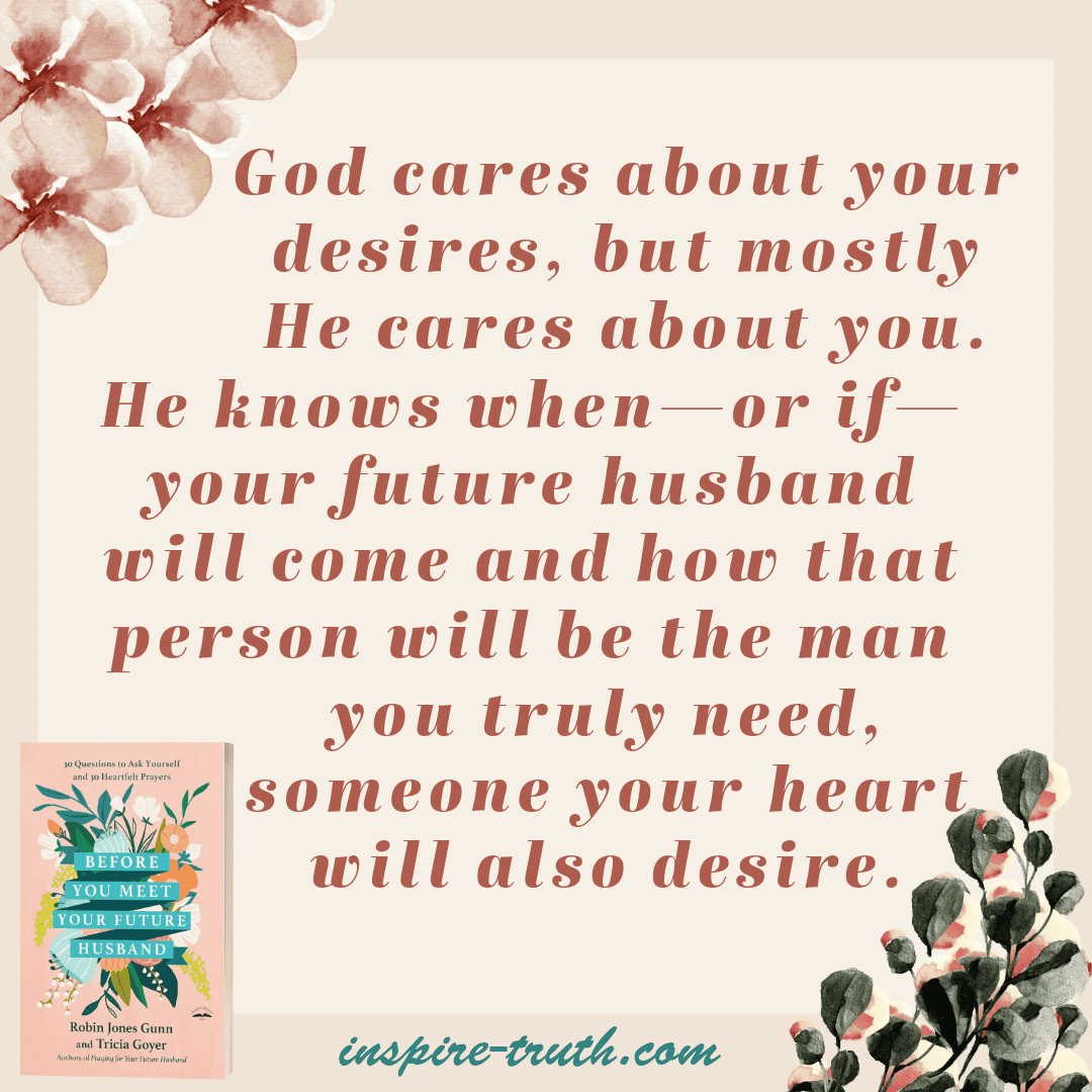 - “God cares about your desires, but mostly He cares about you. He knows when—or if—your future husband will come and how that person will be the man you truly need, someone your heart will also desire.” ~ Robin Jones Gunn and Tricia Goyer
