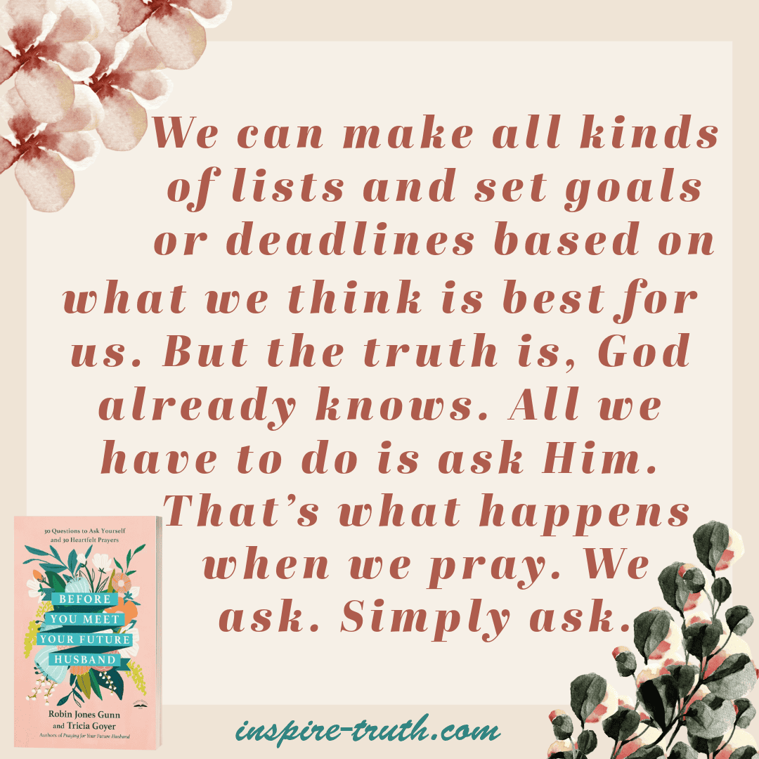 - “We can make all kinds of lists and set goals or deadlines based on what we think is best for us. But the truth is, God already knows. All we have to do is ask Him. That’s what happens when we pray. We ask. Simply ask.” ~ Robin Jones Gunn and Tricia Goyer