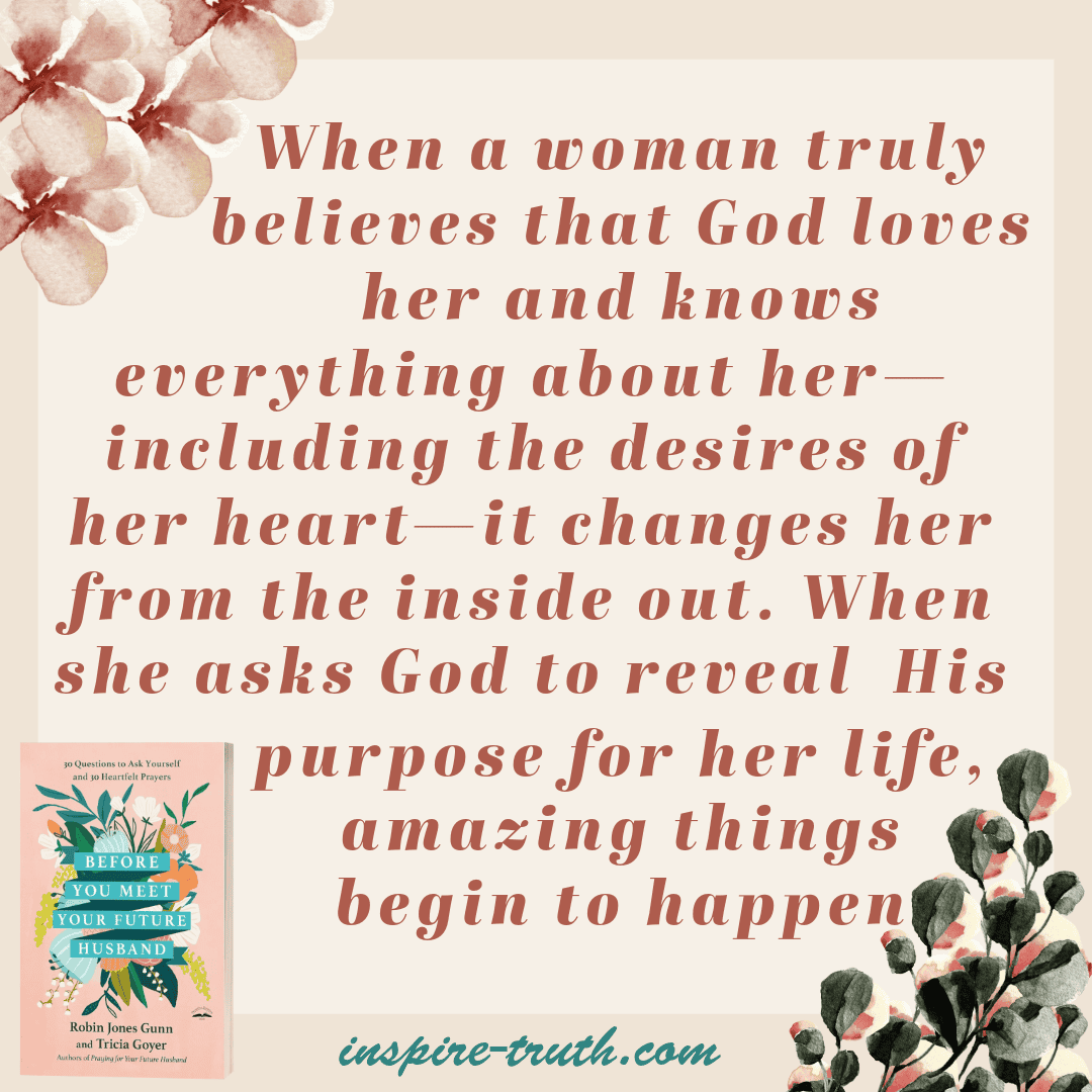 - “When a woman truly believes that God loves her and knows everything about her—including the desires of her heart—it changes her from the inside out. When she asks God to reveal His purpose for her life, amazing things begin to happen.” ~ Robin Jones Gunn and Tricia Goyer