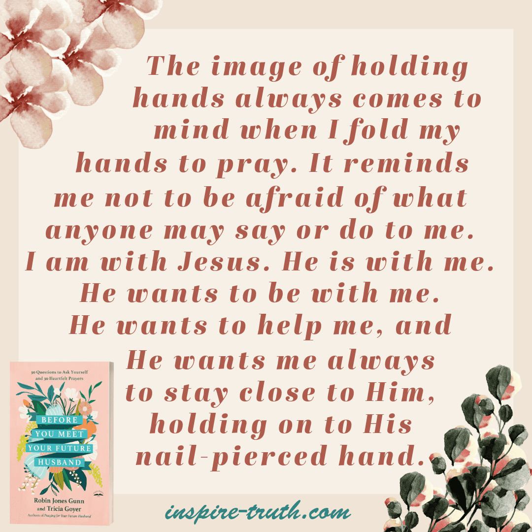 - “The image of holding hands always comes to mind when I fold my hands to pray. It reminds me not to be afraid of what anyone may say or do to me. I am with Jesus. He is with me. He wants to be with me. He wants to help me, and He wants me always to stay close to Him, holding on to His nail-pierced hand.” ~ Robin Jones Gunn and Tricia Goyer