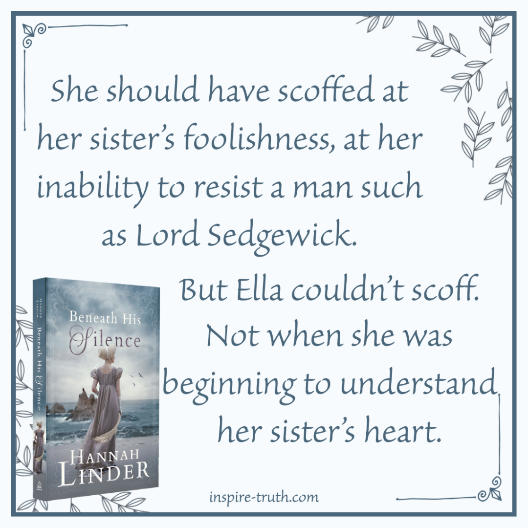 - “She should have scoffed at her sister’s foolishness, at her inability to resist a man such as Lord Sedgewick. But Ella couldn’t scoff. Not when she was beginning to understand her sister’s heart.” ~ Hannah Linder
