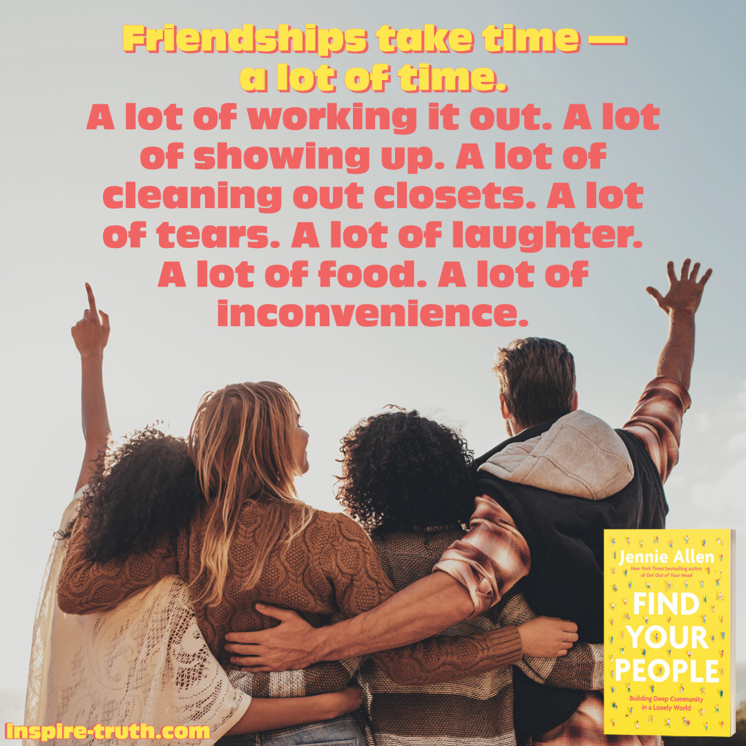 - “Friendships take time—a lot of time. A lot of working it out. A lot of showing up. A lot of cleaning out closets. A lot of tears. A lot of laughter. A lot of food. A lot of inconvenience.” ~ Jennie Allen