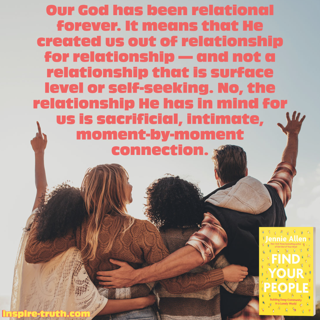- “Our God has been relational forever. It means that He created us out of relationship for relationship—and not a relationship that is surface level or self-seeking. No, the relationship He has in mind for us is sacrificial, intimate, moment-by-moment connection.” ~ Jennie Allen