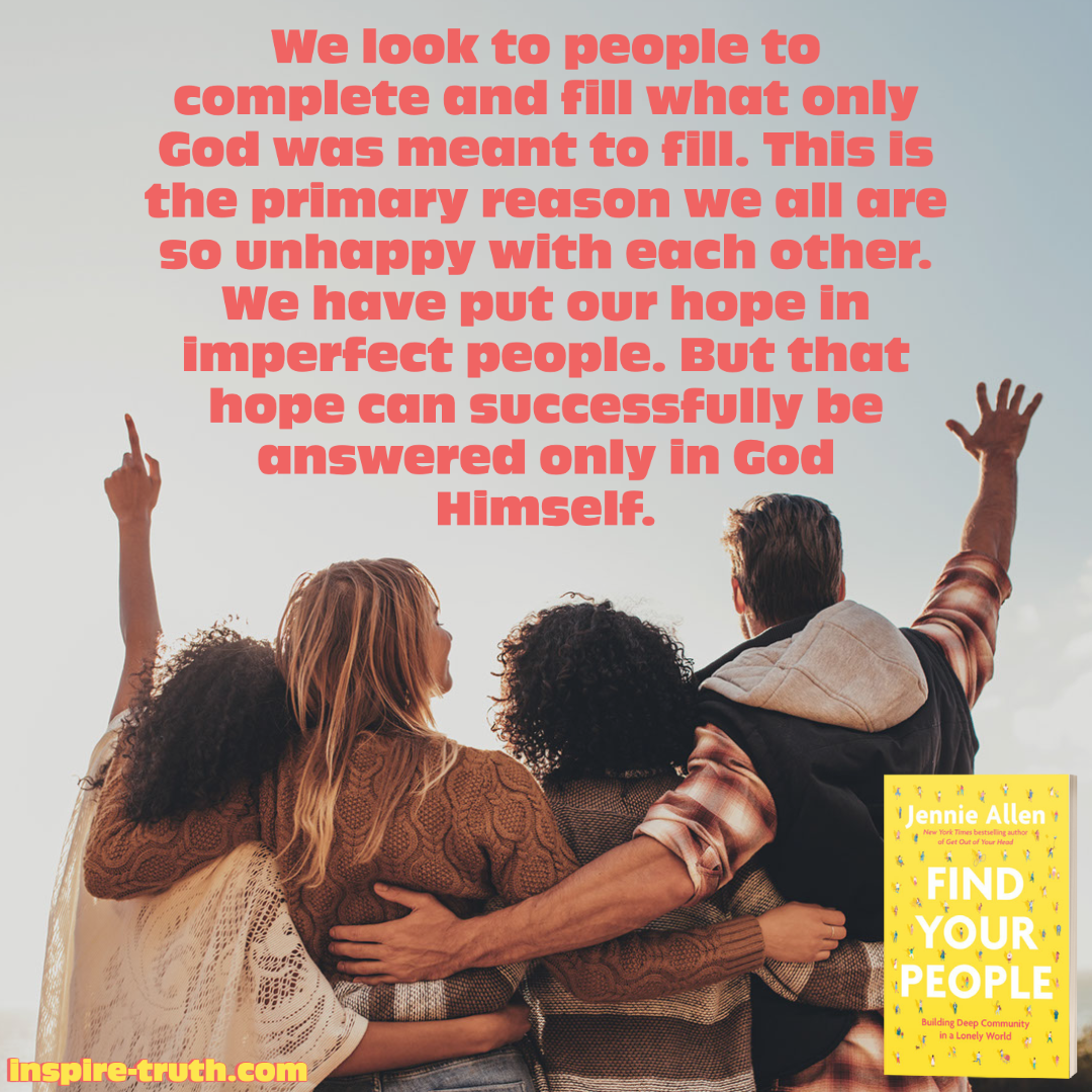- “We look to people to complete and fill what only God was meant to fill. This is the primary reason we all are so unhappy with each other. We have put our hope in imperfect people. But that hope can successfully be answered only in God Himself. Eternity was set in our hearts, Ecclesiastes 3:11 says, which means only a relationship with an eternal God can fill our hearts.” ~ Jennie Allen