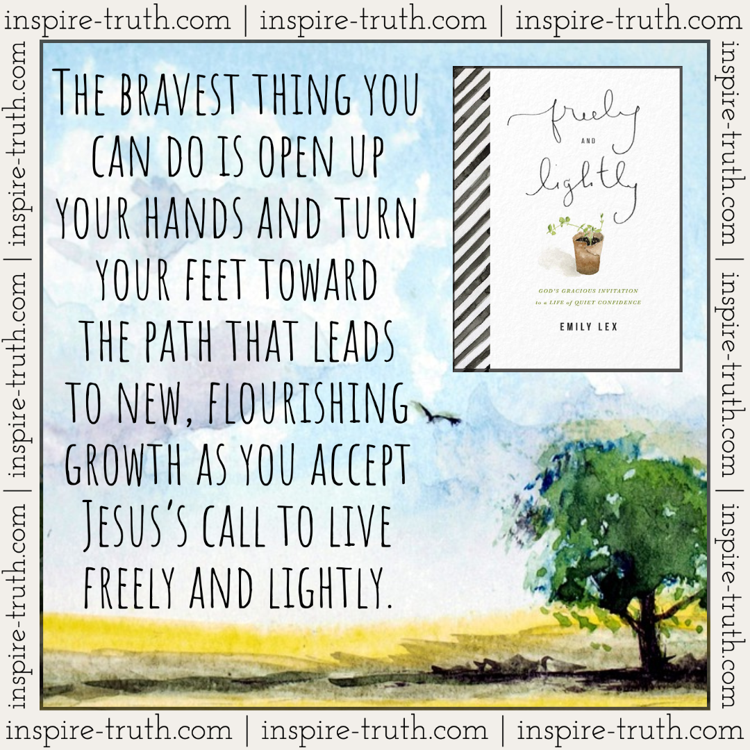 - “The bravest thing you can do is open up your hands and turn your feet toward the path that leads to new, flourishing growth as you accept Jesus’s call to live freely and lightly.” ~ Emily Lex