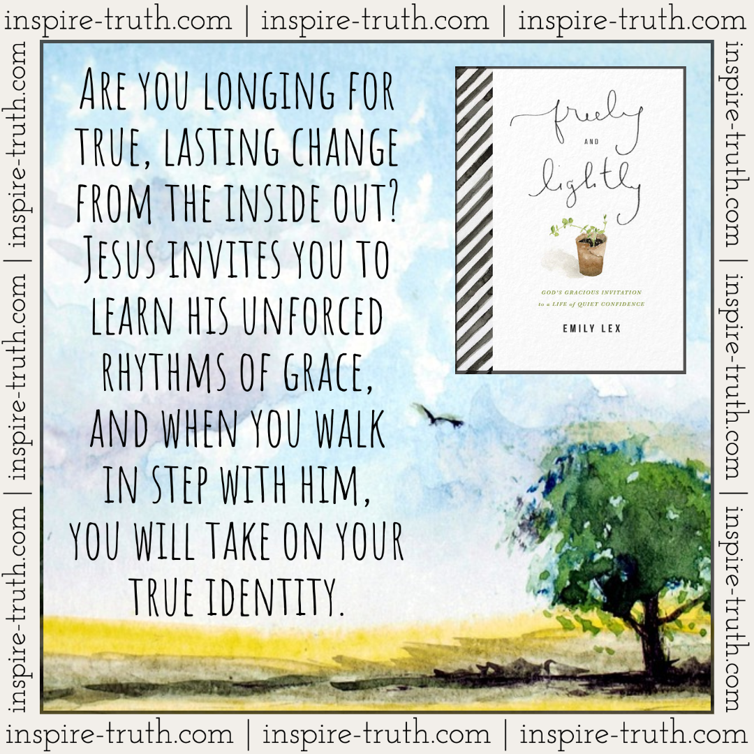 - “Are you longing for true, lasting change from the inside out? Jesus invites you to learn his unforced rhythms of grace, and when you walk in step with him, you will take on your true identity.” ~ Emily Lex