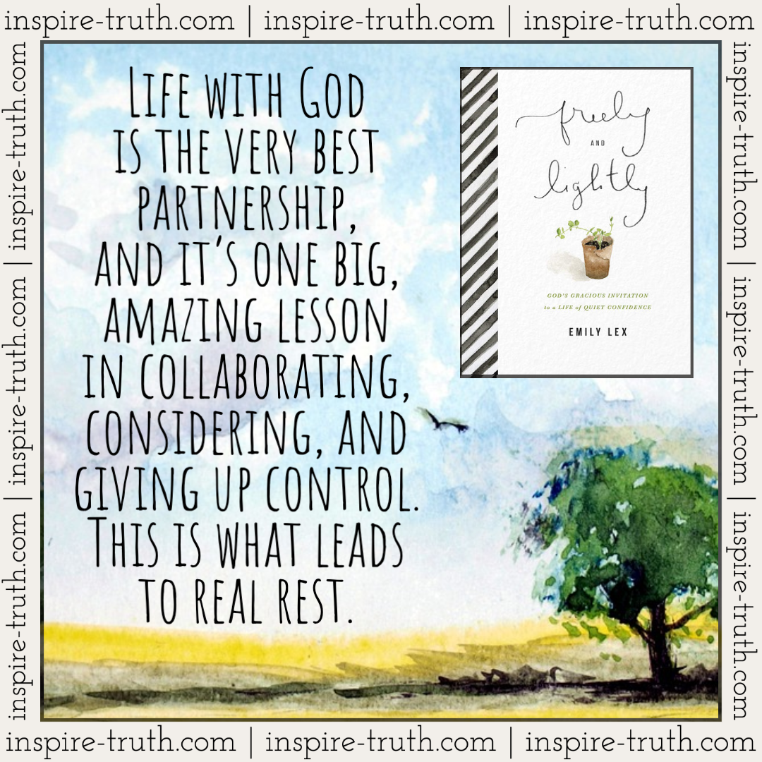 - “Life with God is the very best partnership, and it’s one big, amazing lesson in collaborating, considering, and giving up control. This is what leads to real rest.” ~ Emily Lex