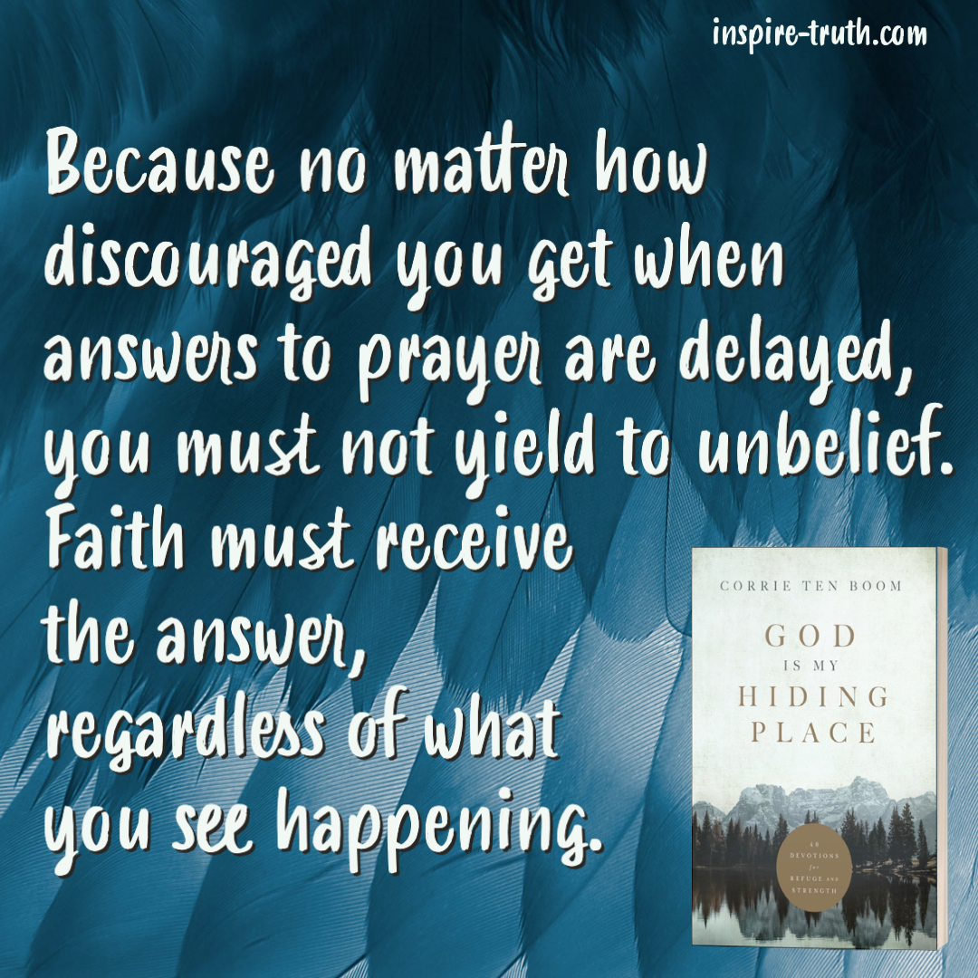 - Because no matter how discouraged you get when answers to prayer are delayed, you must not yield to unbelief. Faith must receive the answer, regardless of what you see happening. ~ Corrie ten Boom