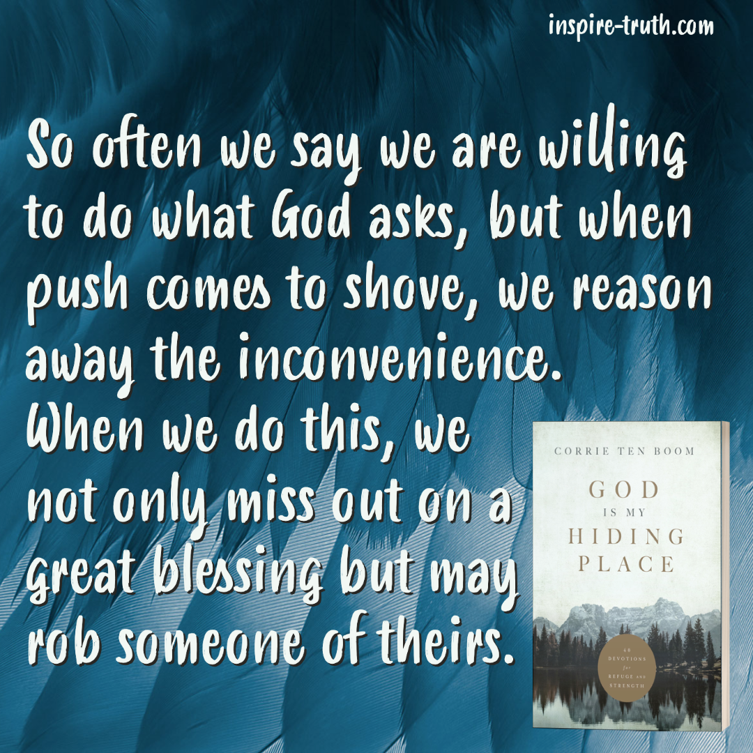 - So often we say we are willing to do what God asks, but when push comes to shove, we reason away the inconvenience. When we do this, we not only miss out on a great blessing but may rob someone of theirs. ~ Corrie ten Boom