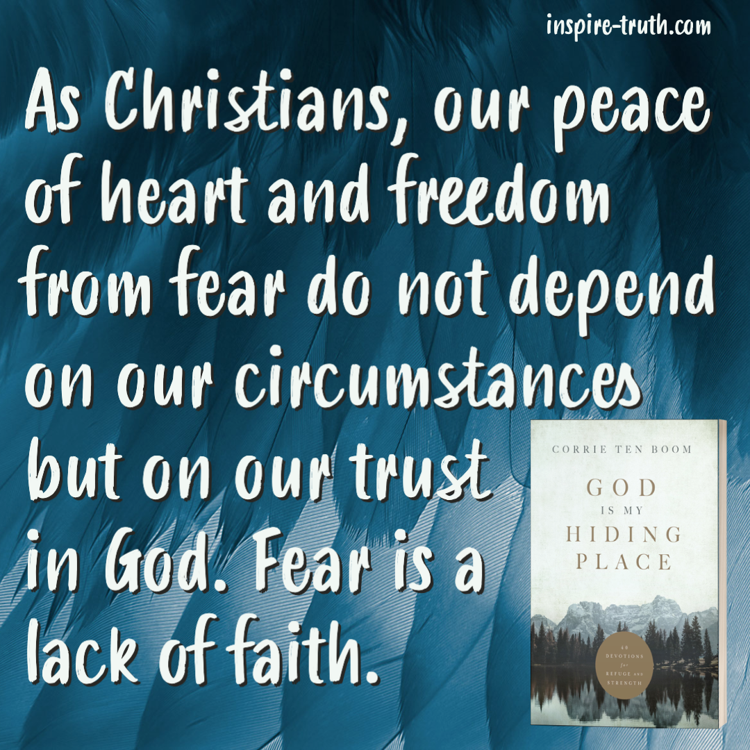 - As Christians, our peace of heart and freedom from fear do not depend on our circumstances but on our trust in God. Fear is a lack of faith. ~ Corrie ten Boom