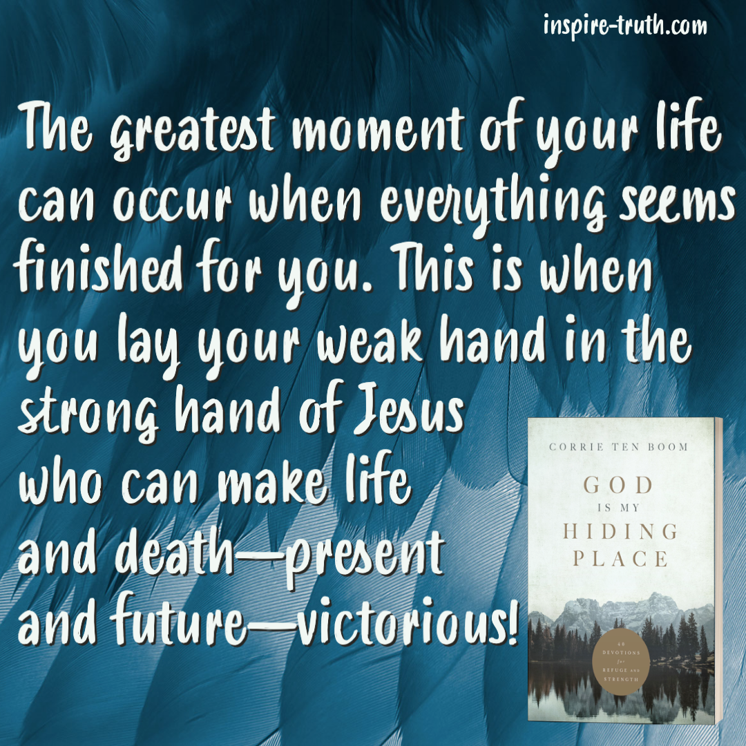 - The greatest moment of your life can occur when everything seems finished for you. This is when you lay your weak hand in the strong hand of Jesus who can make life and death—present and future—victorious! ~ Corrie ten Boom