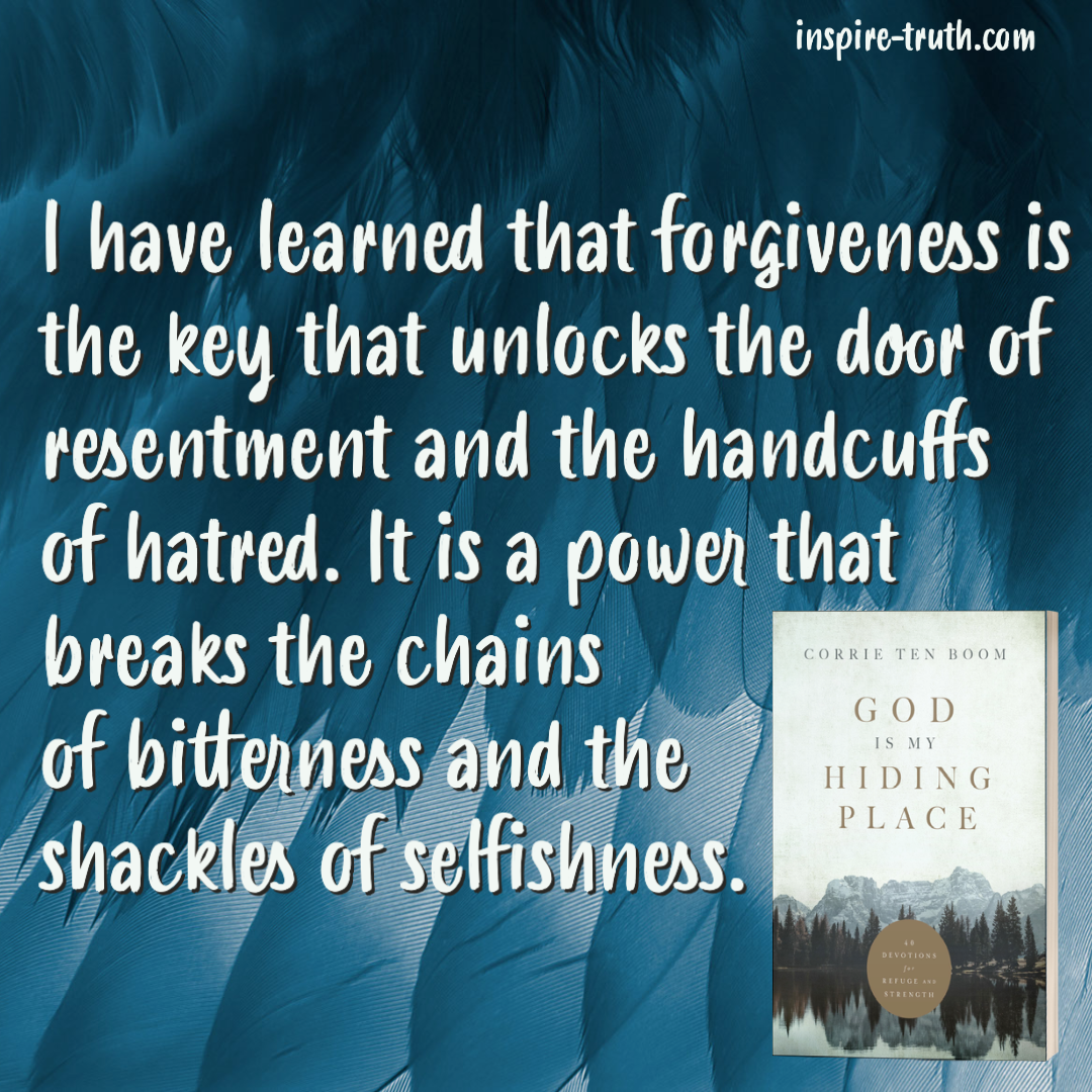 - I have learned that forgiveness is the key that unlocks the door of resentment and the handcuffs of hatred. It is a power that breaks the chains of bitterness and the shackles of selfishness. ~ Corrie ten Boom