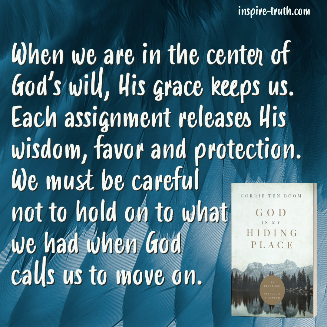 - When we are in the center of God’s will, His grace keeps us. Each assignment releases His wisdom, favor and protection. We must be careful not to hold on to what we had when God calls us to move on. ~ Corrie ten Boom
