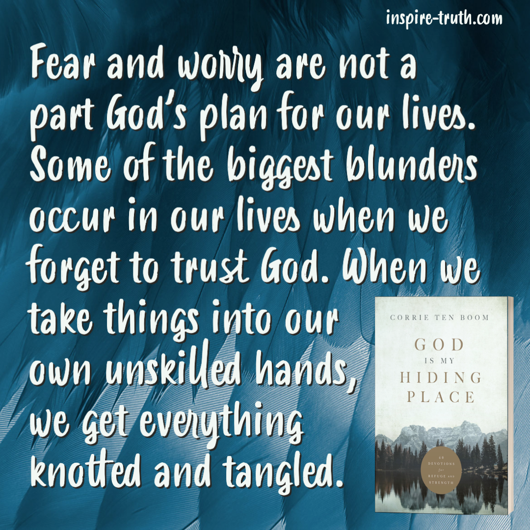 - Fear and worry are not a part God’s plan for our lives. Some of the biggest blunders occur in our lives when we forget to trust God. When we take things into our own unskilled hands, we get everything knotted and tangled. ~ Corrie ten Boom