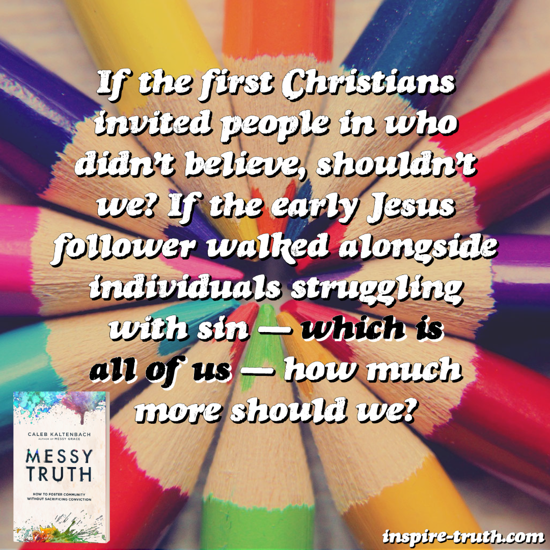 - “If the first Christians invited people in who didn’t believe, shouldn’t we? If the early Jesus follower walked alongside individuals struggling with sin — which is all of us — how much more should we?” ~ Caleb Kaltenbach