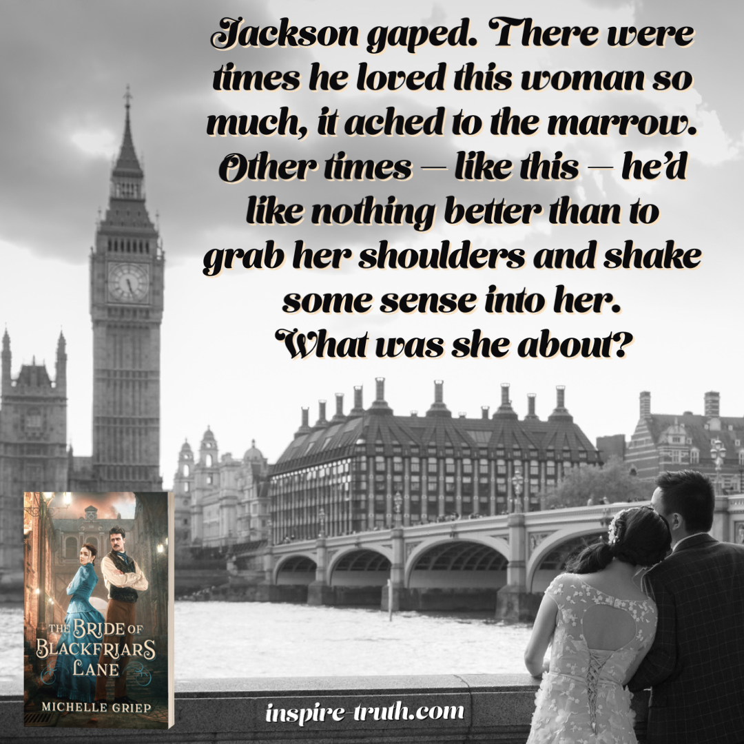 - “Jackson gaped. There were times he loved this woman so much, it ached to the marrow. Other times—like this—he’d like nothing better than to grab her shoulders and shake some sense into her. What was she about?” ~ Michelle Griep
