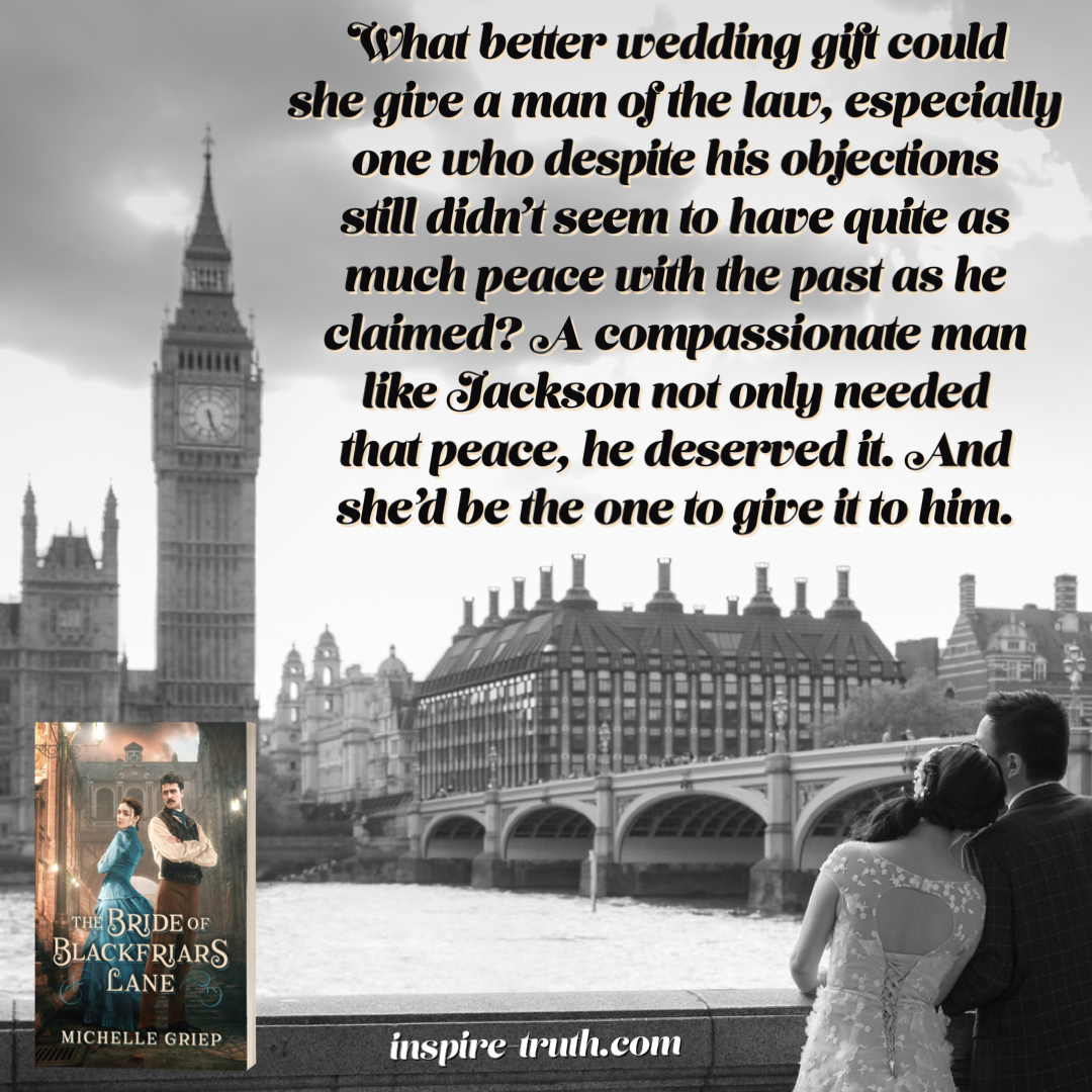 - “What better wedding gift could she give a man of the law, especially one who despite his objections still didn’t seem to have quite as much peace with the past as he claimed? A compassionate man like Jackson not only needed that peace, he deserved it. And she’d be the one to give it to him.” ~ Michelle Griep