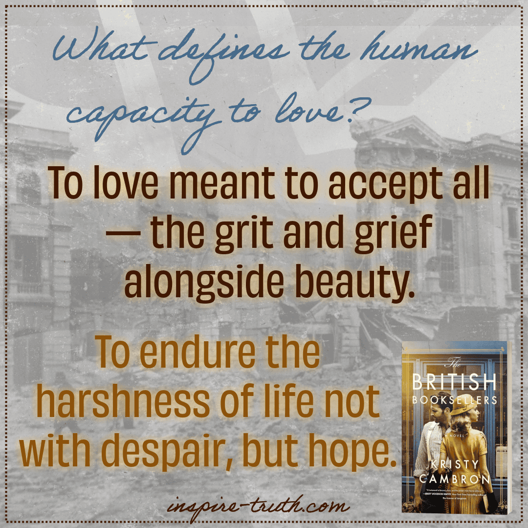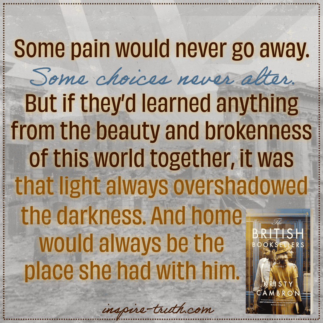 From the very first chapter, I was captivated by The British Booksellers’ depths and the characters’ authenticity. None of us are perfect, and true stories are far from fairytales, yet Kristy Cambron’s ability to portray the imperfections of her characters made their journey all the more relatable and poignant. Through pain, grief, and loss, beauty, hope, and love endure!