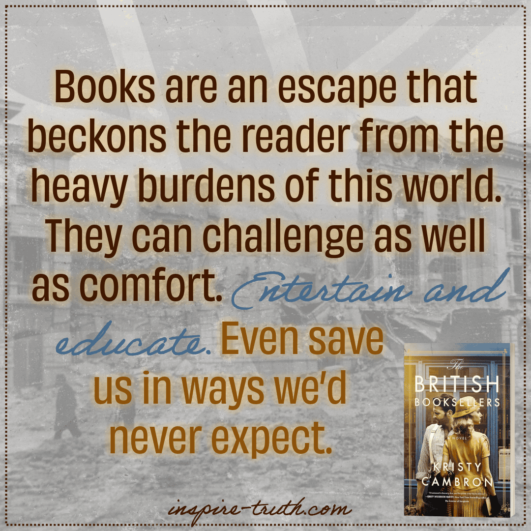 - “Books are an escape that beckons the reader from the heavy burdens of this world. They can challenge as well as comfort. Entertain and educate. Even save us in ways we’d never expect.”~ Kristy Cambron