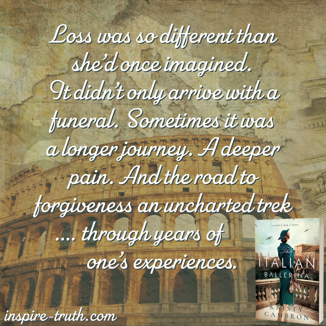 - “Loss was so different than she’d once imagined. It didn’t only arrive with a funeral. Sometimes it was a longer journey. A deeper pain. And the road to forgiveness an uncharted trek through years of one’s experiences.”~ Kristy Cambron