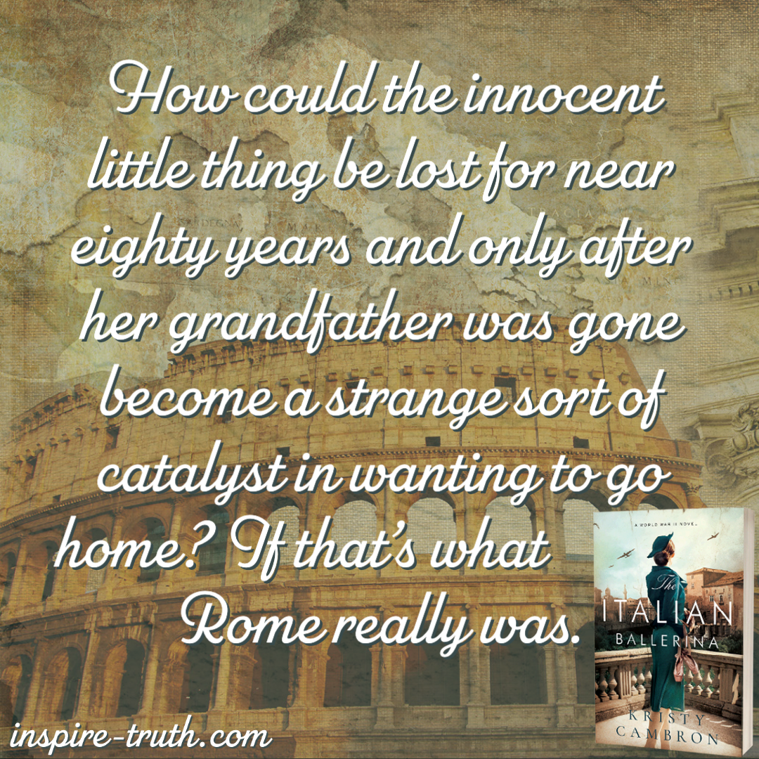 - “How could the innocent little thing be lost for near eighty years and only after her grandfather was gone become a strange sort of catalyst in wanting to go home? If that’s what Rome really was.”~ Kristy Cambron