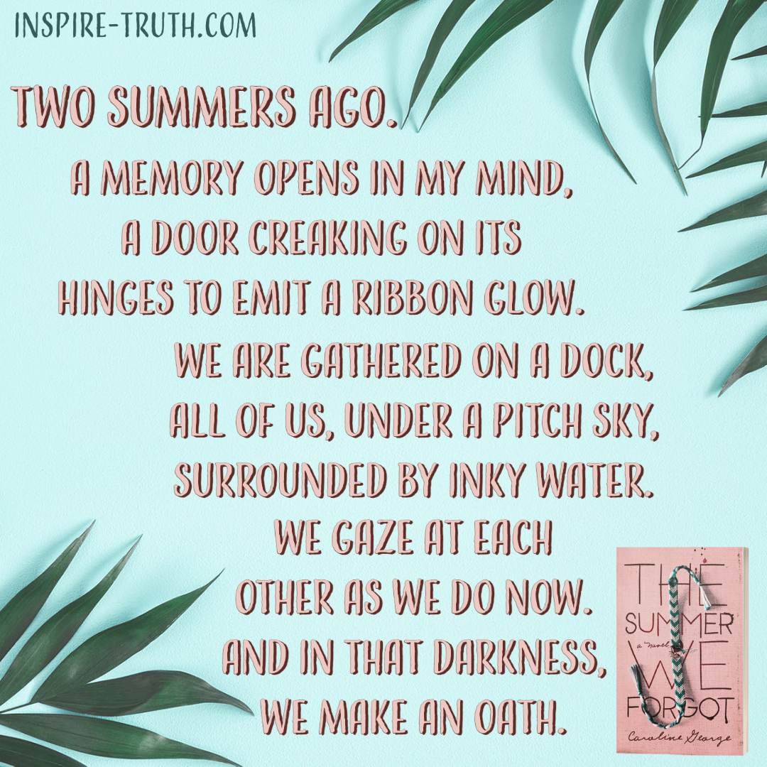 “Two summers ago. A memory opens in my mind, a door creaking on its hinges to emit a ribbon glow. We are gathered on a dock, all of us, under a pitch sky, surrounded by inky water. We gaze at each other as we do now. And in that darkness, we make an oath.” ~ Caroline George