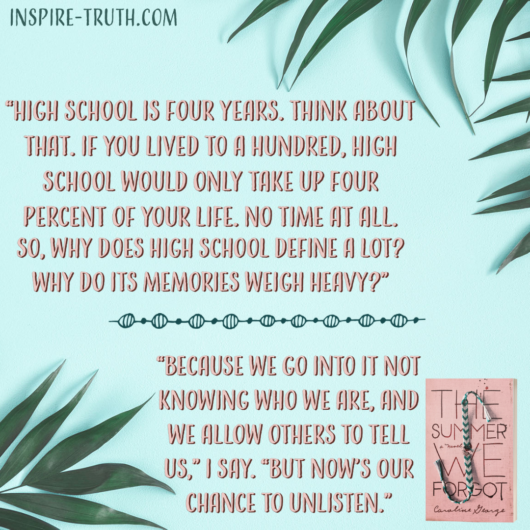- “High school is four years. Think about that. If you lived to a hundred, high school would only take up four percent of your life. No time at all. So, why does high school define a lot? Why do its memories weigh heavy?” “Because we go into it not knowing who we are, and we allow others to tell us,” I say. “But now’s our chance to unlisten.” ~ Caroline George