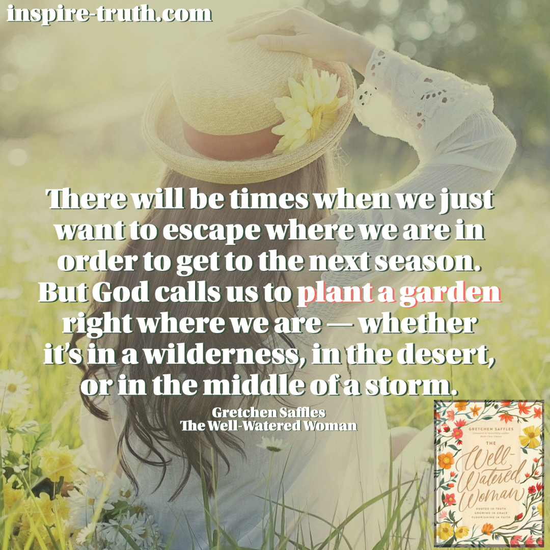 - “There will be times when we just want to escape where we are in order to get to the next season. But God calls us to plant a garden right where we are—whether it’s in a wilderness, in the desert, or in the middle of a storm.” ~ Gretchen Saffles