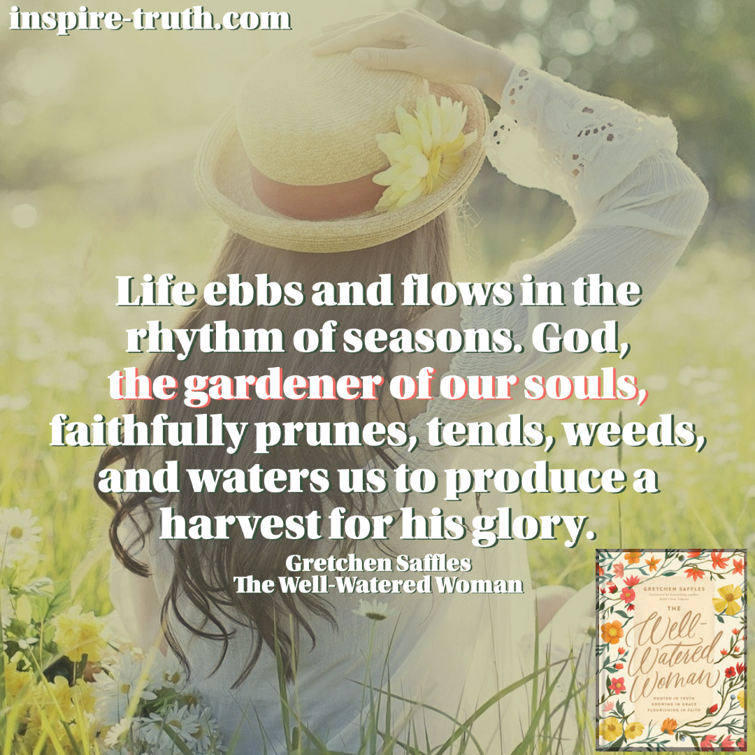 “Life ebbs and flows in the rhythm of seasons. God, the gardener of our souls, faithfully prunes, tends, weeds, and waters us to produce a harvest for his glory.” ~ Gretchen Saffles