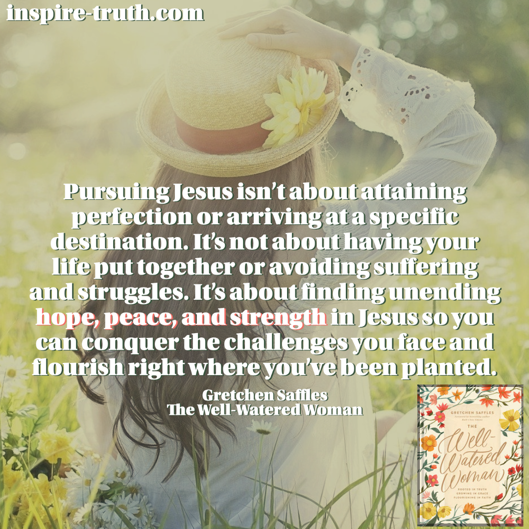 - “Pursuing Jesus isn’t about attaining perfection or arriving at a specific destination. It’s not about having your life put together or avoiding suffering and struggles. It’s about finding unending hope, peace, and strength in Jesus so you can conquer the challenges you face and flourish right where you’ve been planted.” ~ Gretchen Saffles