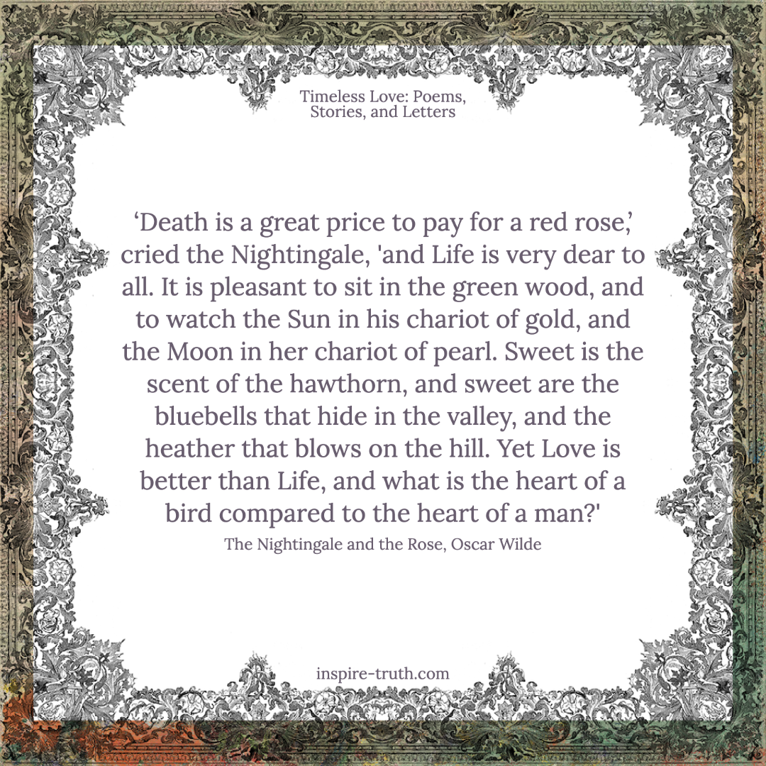 [yasr_multiset setid=0] Ages: 15+- ‘Death is a great price to pay for a red rose,’ cried the Nightingale, ‘and Life is very dear to all. It is pleasant to sit in the green wood, and to watch the Sun in his chariot of gold, and the Moon in her chariot of pearl. Sweet is the scent of the hawthorn, and sweet are the bluebells that hide in the valley, and the heather that blows on the hill. Yet Love is better than Life, and what is the heart of a bird compared to the heart of a man?’ ~ Oscar Wilde, The Nightingale and the Rose