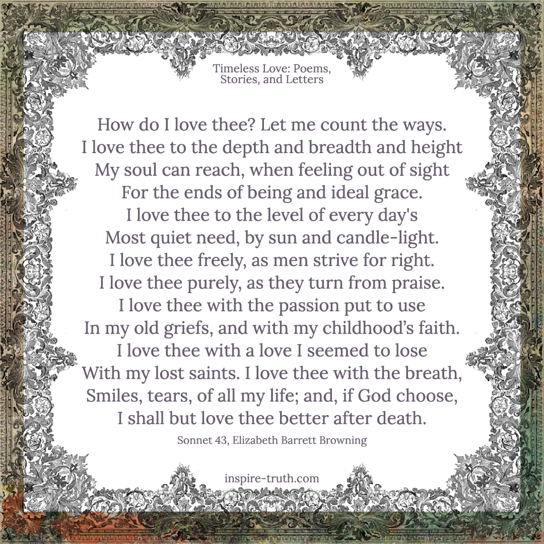 - How do I love thee? Let me count the ways. I love thee to the depth and breadth and height My soul can reach, when feeling out of sight For the ends of being and ideal grace. I love thee to the level of every day’s Most quiet need, by sun and candle-light. I love thee freely, as men strive for right. I love thee purely, as they turn from praise. I love thee with the passion put to use In my old griefs, and with my childhood’s faith. I love thee with a love I seemed to lose With my lost saints. I love thee with the breath, Smiles, tears, of all my life; and, if God choose, I shall but love thee better after death. ~ Elizabeth Barrett Browning, Sonnet 43