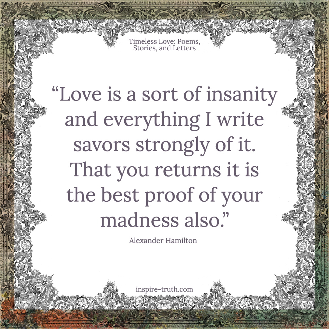 - “Love is a sort of insanity and everything I write savors strongly of it. That you returns it is the best proof of your madness also.” ~ Alexander Hamilton